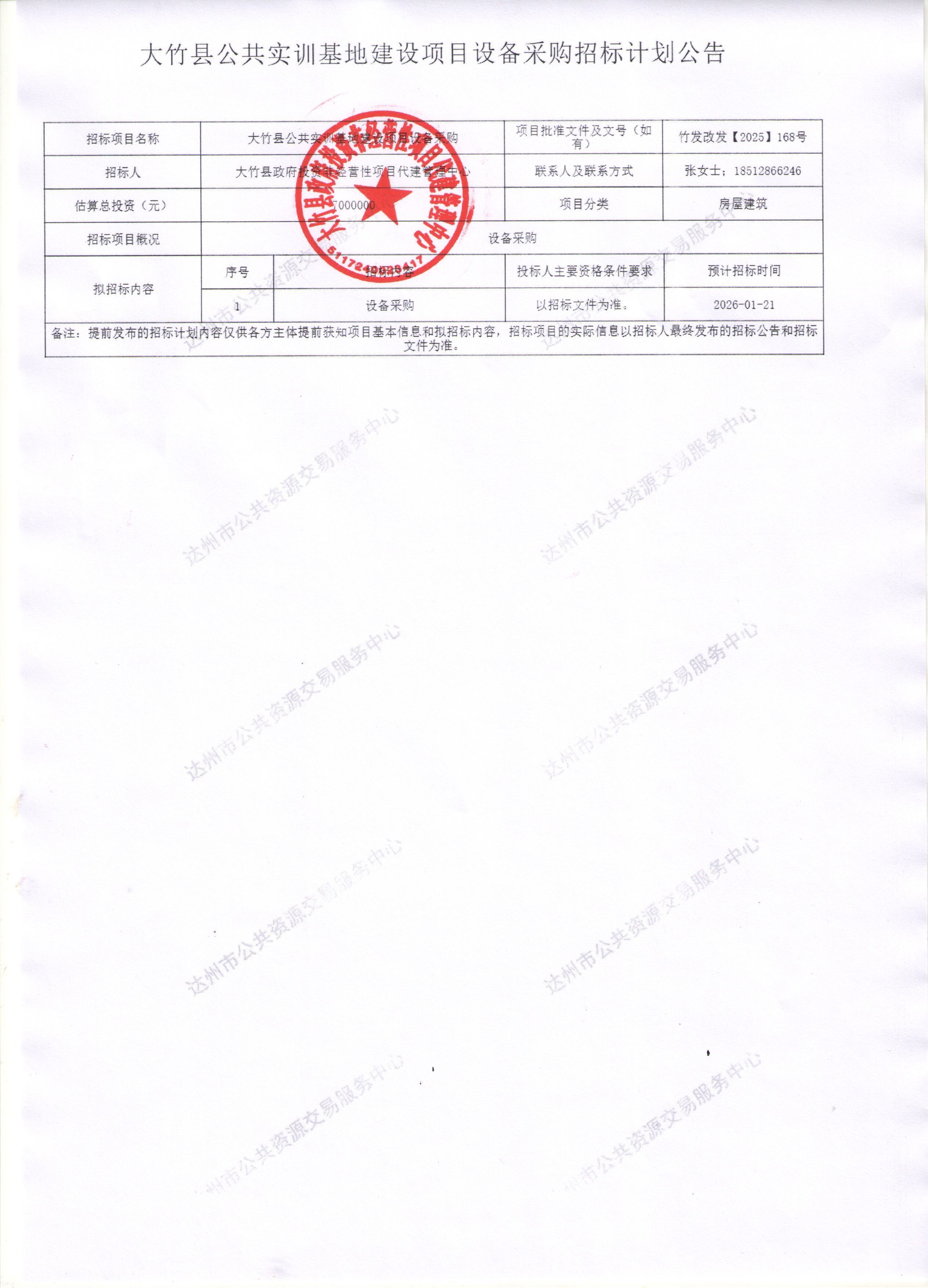 大竹县公共实训基地建设项目设备采购招标计划公告