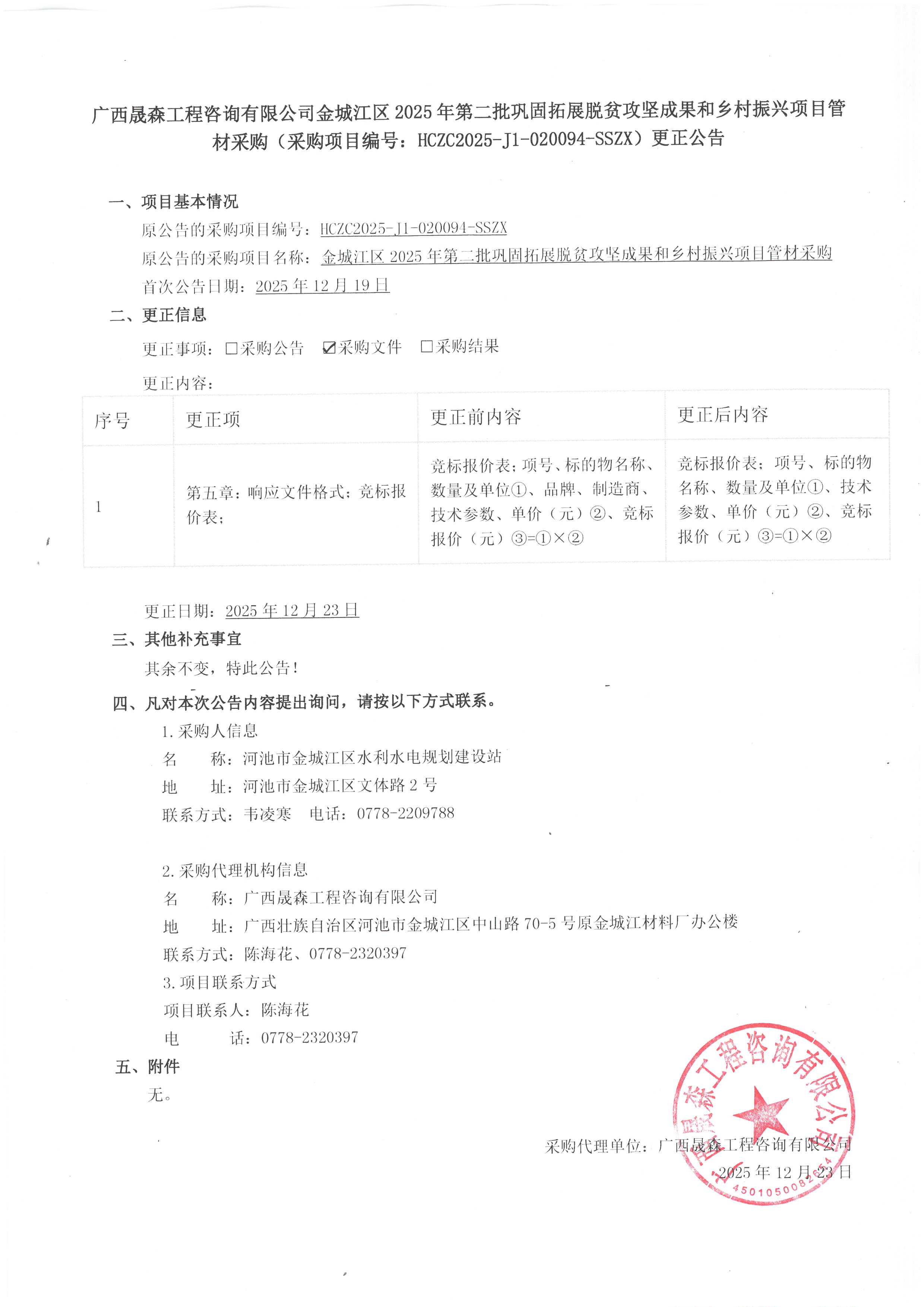 广西晟森工程咨询有限公司金城江区2025年第二批巩固拓展脱贫攻坚成果和乡村振兴项目管材采购(采购项目编号:HCZC2025-J1-020094-SSZX)更正公告